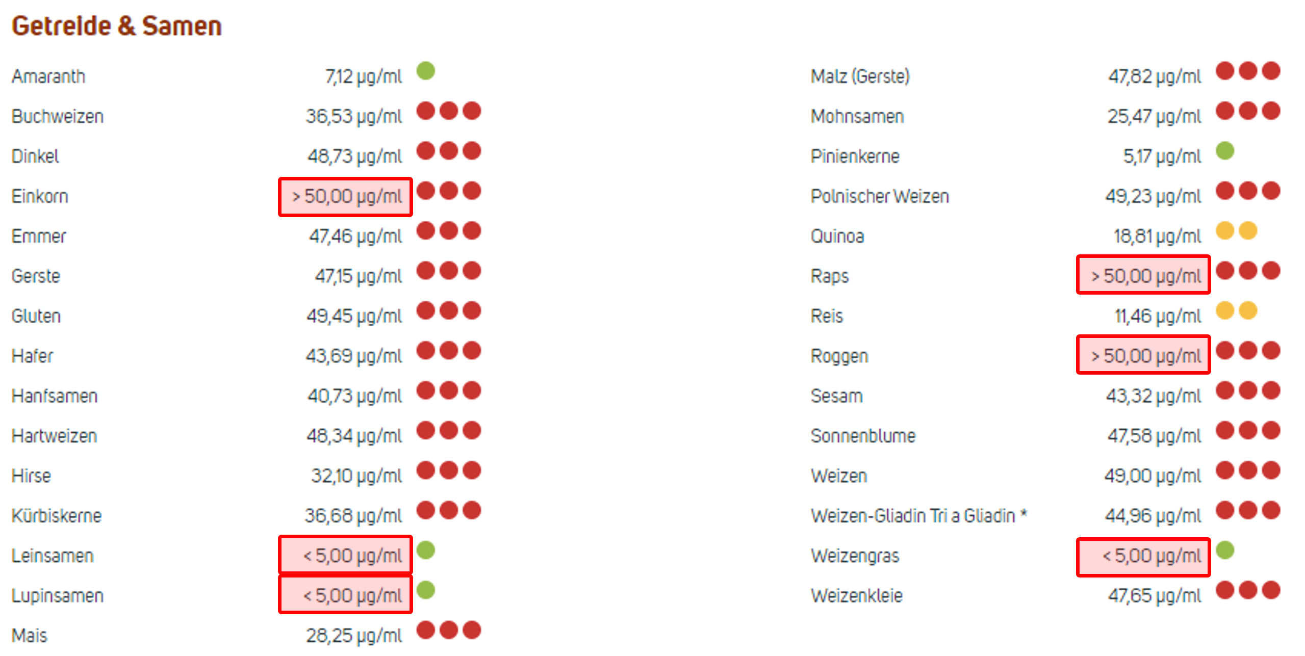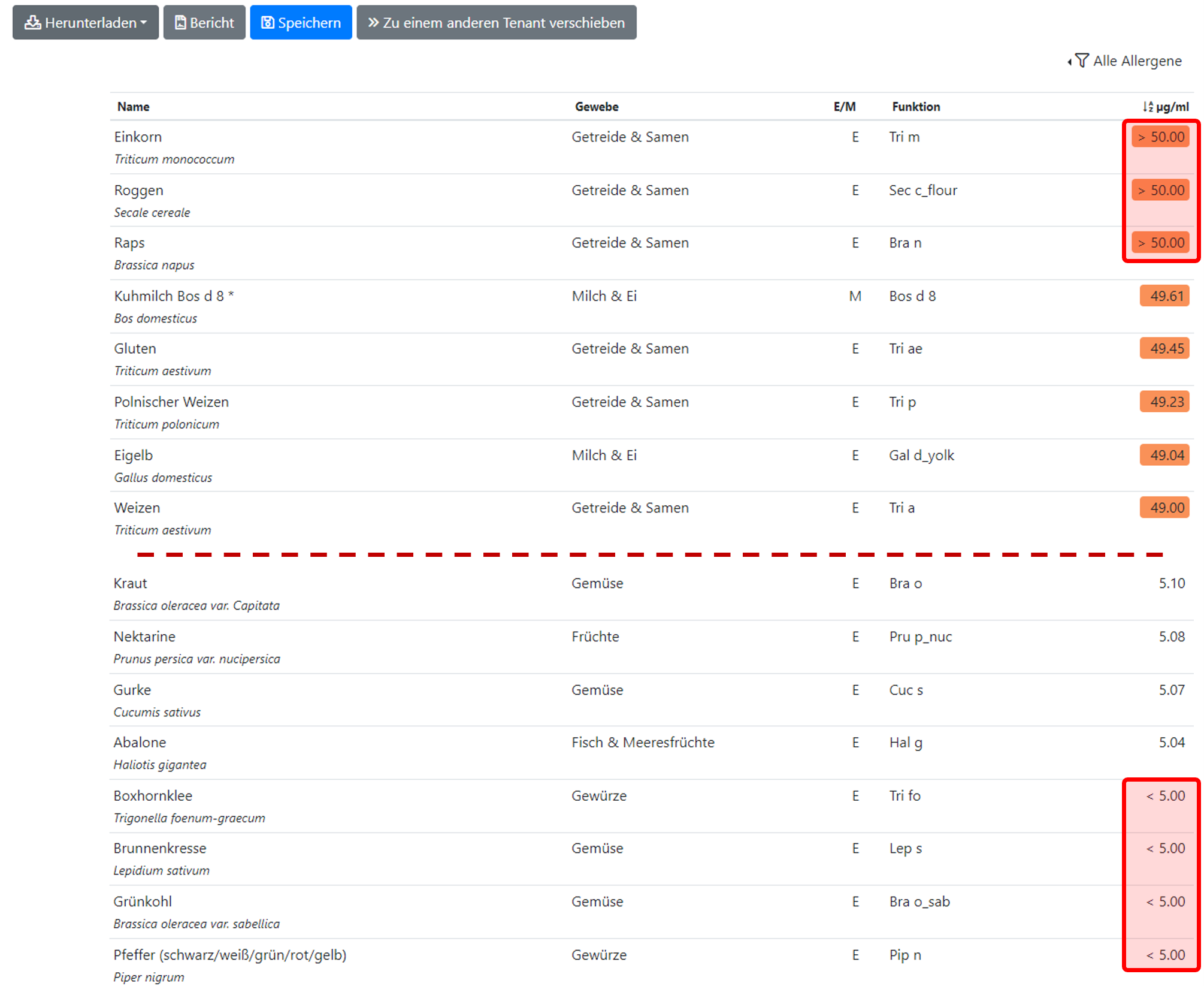 Im Zuge der Vereinheitlichung der Wertedarstellung wurden bisher FOX-Messwerte unterhalb des Schwellenwerts (< 5 µg/ml) bzw. oberhalb des Schwellenwerts (> 50 µg/ml) in den verschiedenen Darstellungsformaten nicht in gleicher Weise angezeigt. Ab Version 1.18 werden die Werte als Bereiche dargestellt, wobei durchgängig die Symbole „kleiner als“ und „größer als“ verwendet werden. Beispiele: