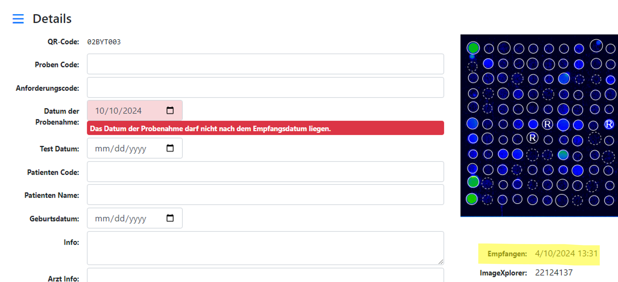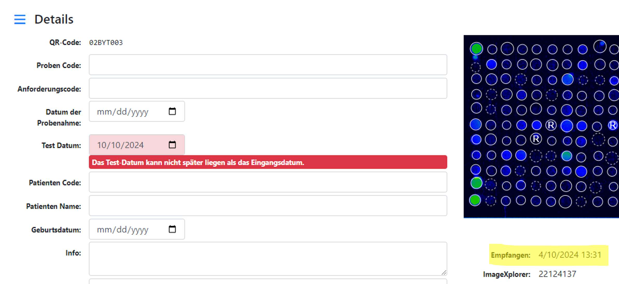 Da sowohl das Probenahmedatum als auch das Testdatum optionale Felder sind, die vom Benutzer manuell eingegeben werden, haben wir eine neue Validierung hinzugefügt, um sicherzustellen, dass die Patienteninformationen weniger fehleranfällig sind. Wenn Sie versuchen, eines dieser Daten später als das Empfangsdatum der Messung in RAPTOR SERVER einzugeben, wird eine Warnmeldung angezeigt.