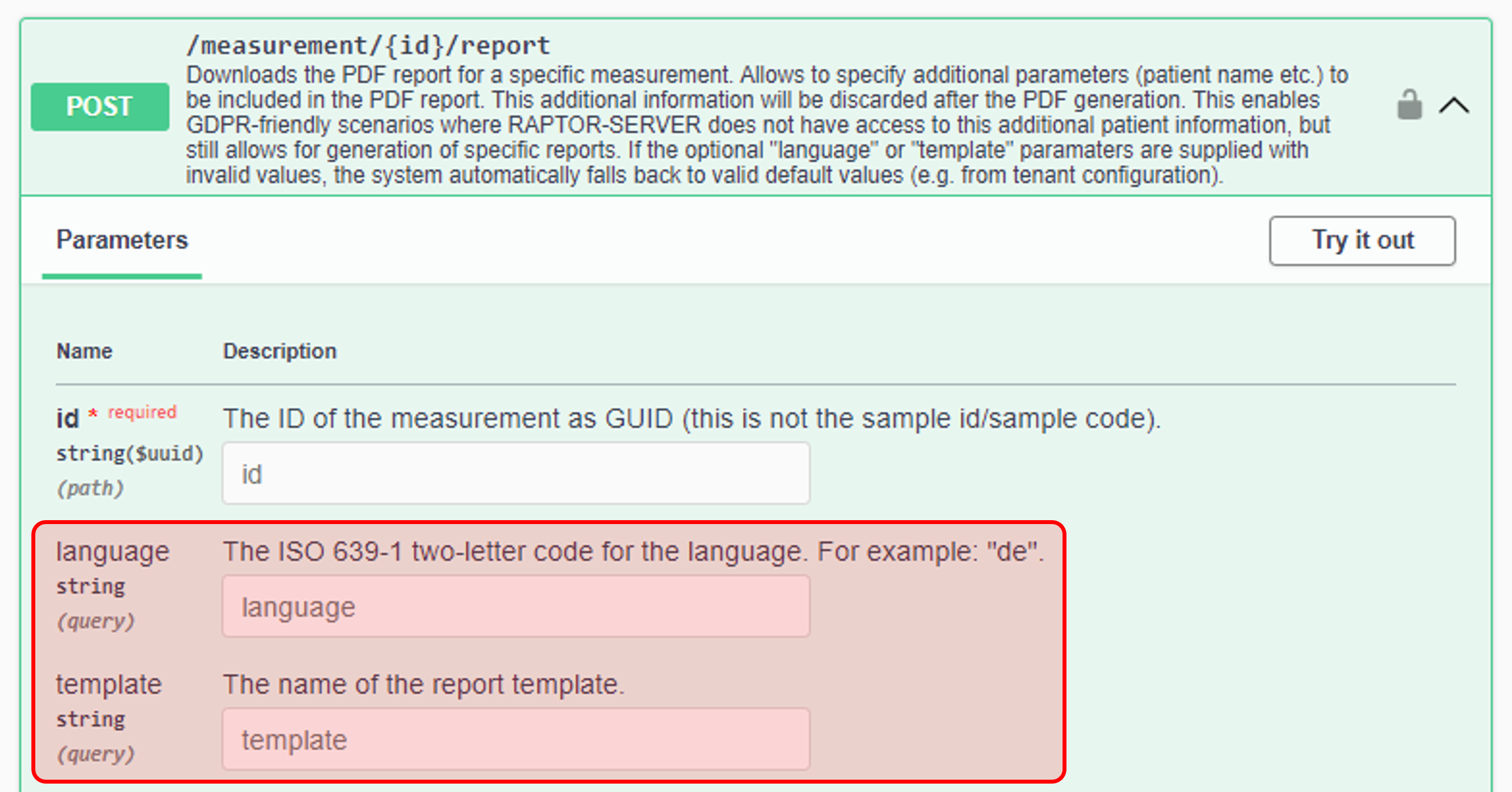 Beim Abrufen eines PDF-Berichts über die Endpoints GET/measurement/(id)/report und POST/measurement/(id)/report ist es jetzt möglich, zwei neue optionale Parameter zu verwenden: „language“ und „template“. Um den Sprachparameter zu verwenden, stellen Sie bitte sicher, dass Sie den zweistelligen ISO 639-1 Code verwenden (z.B.: „de“).