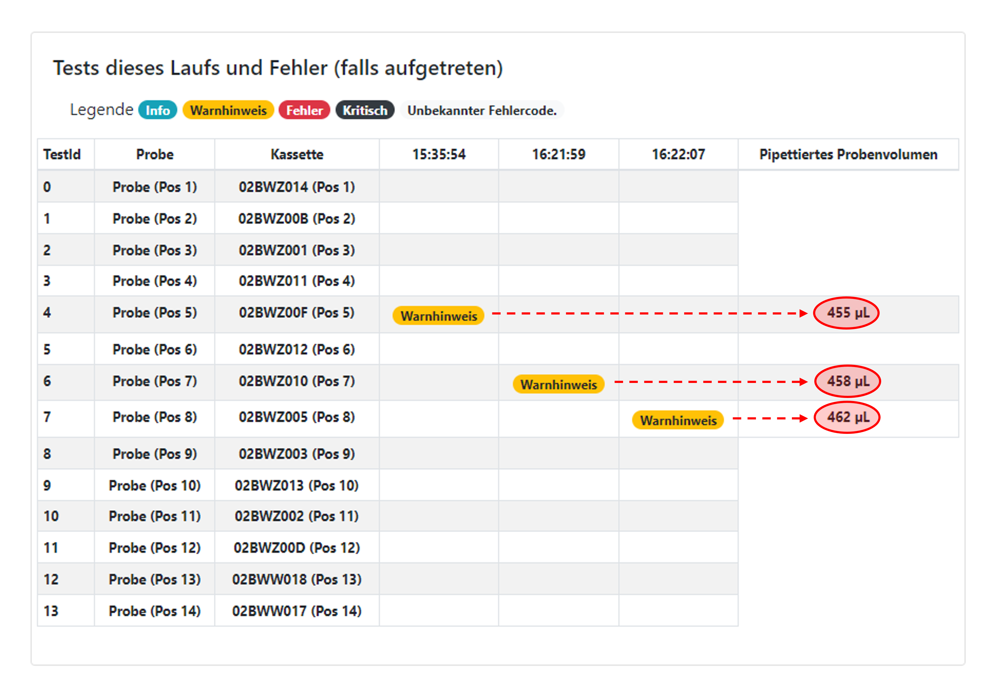 Für RAPTOR SERVER-Benutzer ist es jetzt einfacher, einen möglichen Pipettierfehler nach einem Lauf zu erkennen. Wenn ein Fehler oder eine Warnung aufgrund eines möglichen Pipettierproblems für eine bestimmte Probe ausgelöst wird, erscheint auf der rechten Seite der Tabelle eine neue Spalte mit dem gemessenen pipettierten Volumen der Probe.