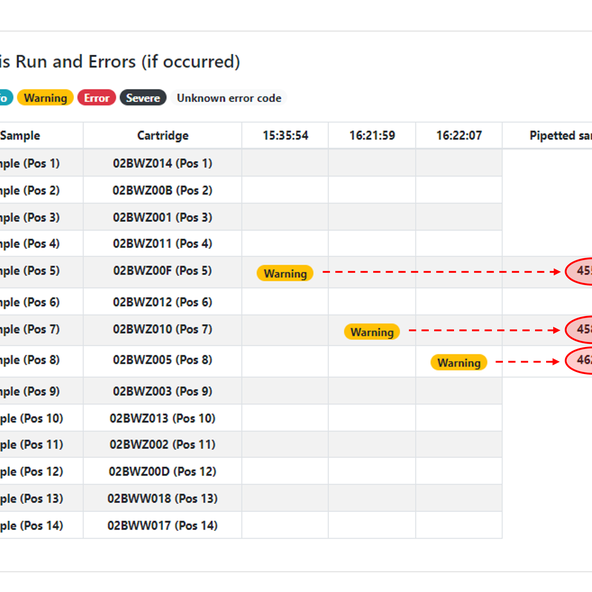 It's now easier for RAPTOR SERVER users to identify a possible pipetting error after a run. If an error or warning is triggered due to a possible pipetting problem for a specific sample, a new column will appear on the right of the table showing the measured pipetted volume of the sample.